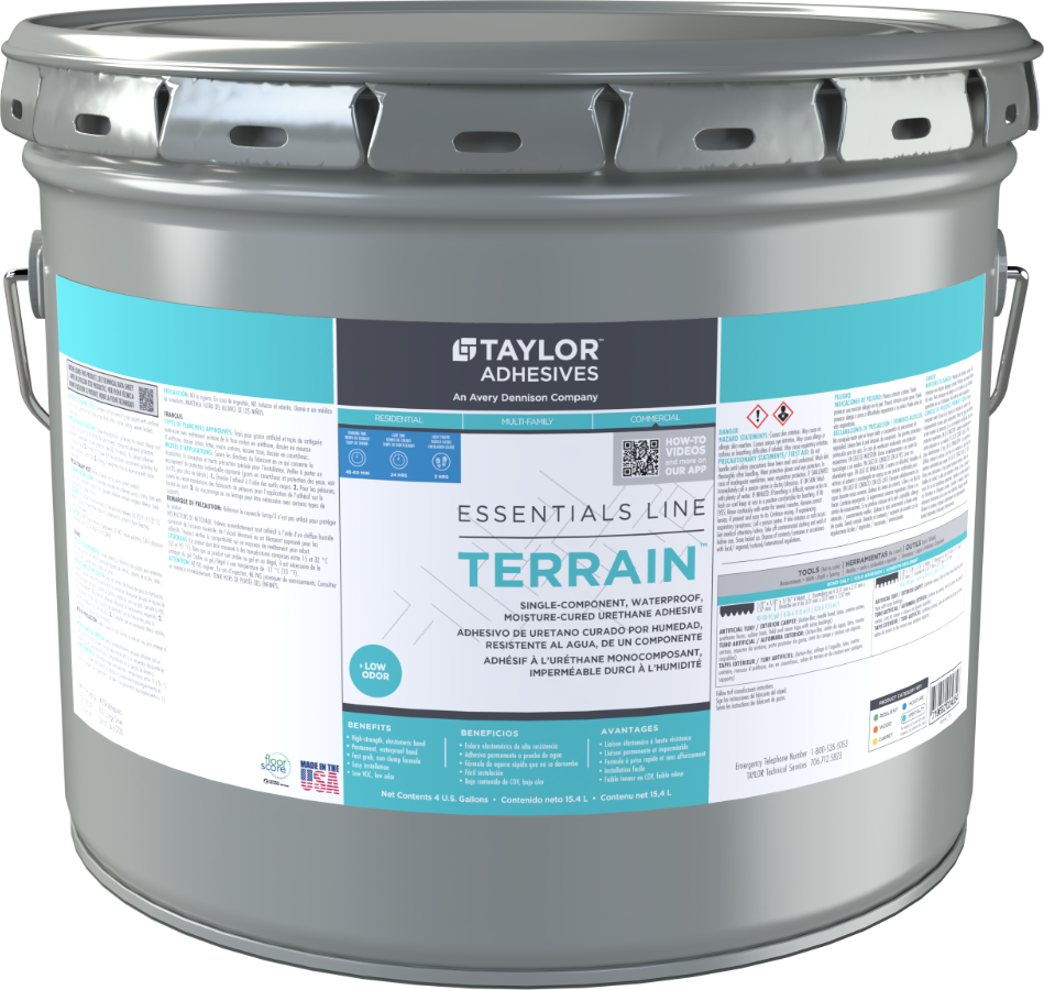 Terrain is a low V.O.C., one component, moisture curing polyurethane adhesive designed for easy indoor and outdoor application of synthetic turf and exterior grade carpets over concrete or wood substrates.